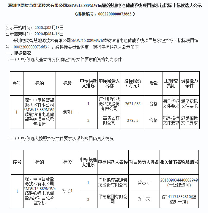近日,深圳電網(wǎng)智慧能源技術(shù)公司5MW/15.889MWh磷酸鐵鋰電池儲(chǔ)能系統(tǒng)項(xiàng)目EPC中標(biāo)候選人公示,鵬輝能源以投標(biāo)單價(jià)1.65元/Wh獲得中標(biāo)。資料顯示鵬輝能源是國(guó)內(nèi)主要電池供應(yīng)商之一,在2020年上半年動(dòng)力電池裝機(jī)量排名中位于第11位。2019年4月,鵬輝能源曾與天合光能全資子公司天合科技達(dá)成合作,注冊(cè)資本為3億元,鵬輝能源持股51%,雙方共同出資成立江蘇天輝鋰電池有限公司、布局儲(chǔ)能市場(chǎng)。此次是鵬輝能源首次參與中標(biāo)儲(chǔ)能項(xiàng)目EPC。