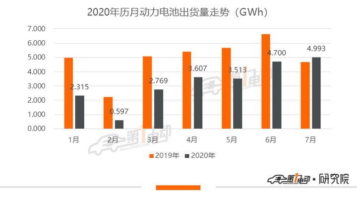 根據工信部合格證產量數據,2020年7月共產出新能源汽車9.58萬輛,環(huán)比增長4.9%。根據第一電動研究院的統計測算,動力電池7月裝機量約為5GWh,同比增長6.42%,實現了今年的首次正增長,環(huán)比也同樣上漲了6.3%。