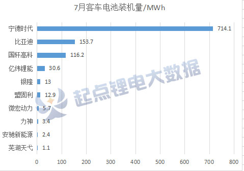 7月客車配套電池企業(yè)共有10家,分別是寧德時(shí)代、比亞迪、國軒高科、億緯鋰能、銀隆、盟固利、微宏動(dòng)力、力神、安馳新能源和蕪湖天弋,其中僅寧德時(shí)代一家占比67.8%。