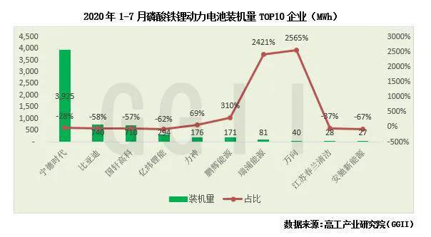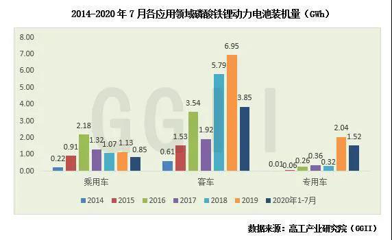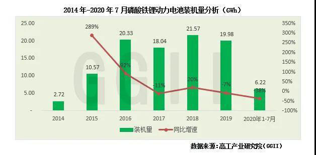通過(guò)高工產(chǎn)業(yè)研究院(GGII)發(fā)布的《動(dòng)力電池月度數(shù)據(jù)庫(kù)》統(tǒng)計(jì)顯示,2020年1-7月磷酸鐵鋰動(dòng)力電池累計(jì)配套新能源汽車(chē)約6.9萬(wàn)輛,同比下降15%;裝機(jī)量合計(jì)約6.22GWh,同比下降38%。