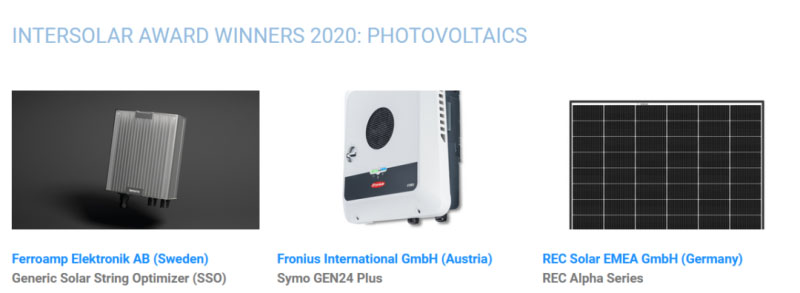 今年獲得Intersolar Award 2020的光伏企業(yè)(及其獲獎產(chǎn)品)共有三家:來自瑞典的FerroamElektronik AB, 奧地利逆變器企業(yè)Fronius Internatioanl GmbH和德國的REC Solar.獲得大獎的產(chǎn)品分別是Generic SolarString Optimizer, Symo GEN 24Plus 以及REC的Alpha series系列組件。