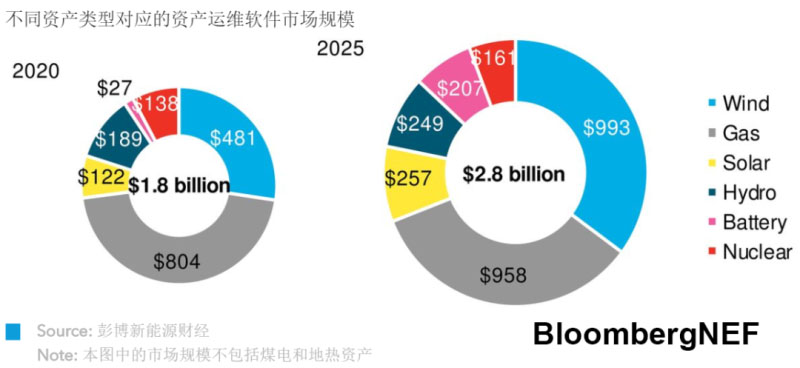 2020年,發(fā)電資產(chǎn)業(yè)主用于氣電、光伏、核電、水電和儲能資產(chǎn)的監(jiān)控、維護(hù)和優(yōu)化軟件的支出預(yù)計(jì)達(dá)18億美元。到2025年,實(shí)時(shí)監(jiān)控、先進(jìn)運(yùn)維分析軟件、無人機(jī)巡檢軟件以及增強(qiáng)現(xiàn)實(shí)軟件的市場總規(guī)模預(yù)計(jì)擴(kuò)大至28億美元,增長60%。服務(wù)提供商、工業(yè)企業(yè)、初創(chuàng)企業(yè)以及云服務(wù)商之間合作與競爭并存。