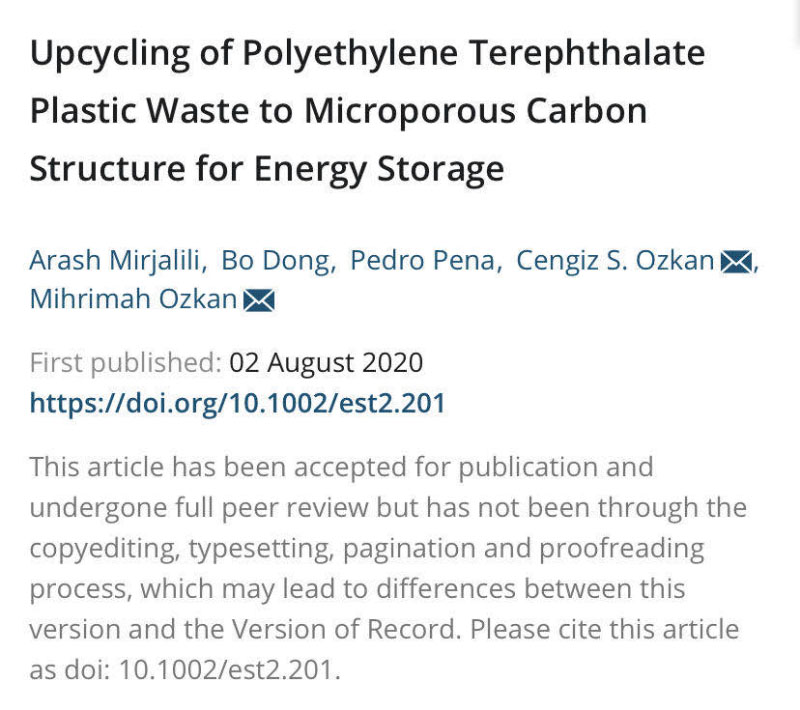 現(xiàn)在,在《儲能》雜志上發(fā)表的一篇開放獲取的文章中,來自加州大學河濱分校(UCR)的科學家們正在以一種由更新的塑料廢料制成的納米材料的形式開發(fā)超級電容器,這將有機會同時解決以上兩大問題。