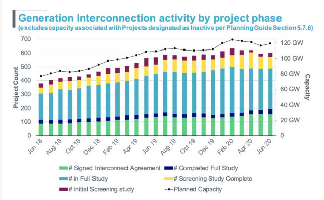 儲能開發(fā)商在今年要求德州電力可靠性委員會(ERCOT)對總計裝機容量4.9GW的32個電池儲能項目進行全面互連研究,而德州電力可靠性委員會(ERCOT)在今年只完成了9項研究,其裝機容量總計僅為0.7GW。在2019年,德州電力可靠性委員會(ERCOT)只批準了總裝機容量為205MW的兩個電池儲能項目,與此同時卻收到了43項電池儲能系統(tǒng)審批申請,其總裝機容量為4.1GW。