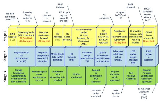 德州電力可靠性委員會(ERCOT)審批的過程如下所示,其全面互連研究的內(nèi)容在下圖第一行的中間:
