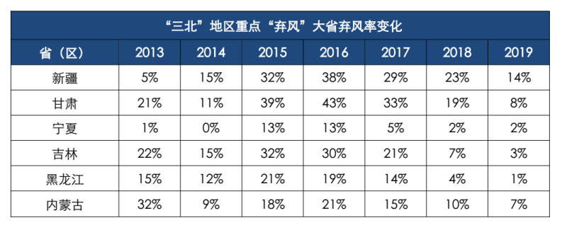 三北地區(qū)擁有的技術(shù)可開發(fā)風(fēng)電資源占全國的80%。截至2019年底,三北地區(qū)的裝機(jī)容量占全國70%。棄風(fēng)限電的情況近幾年逐漸好轉(zhuǎn),2019年全國平均棄風(fēng)率4%,同比下降3個百分點。