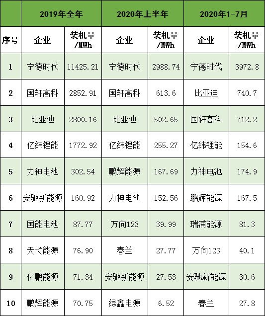 至2020年1-7月,磷酸鐵鋰電池裝機量TOP10再度發(fā)生變化,分別是寧德時代、比亞迪、國軒高科、億緯鋰能、力神、鵬輝電源、瑞浦能源、萬向一二三、安馳新能源和春蘭清潔能源。