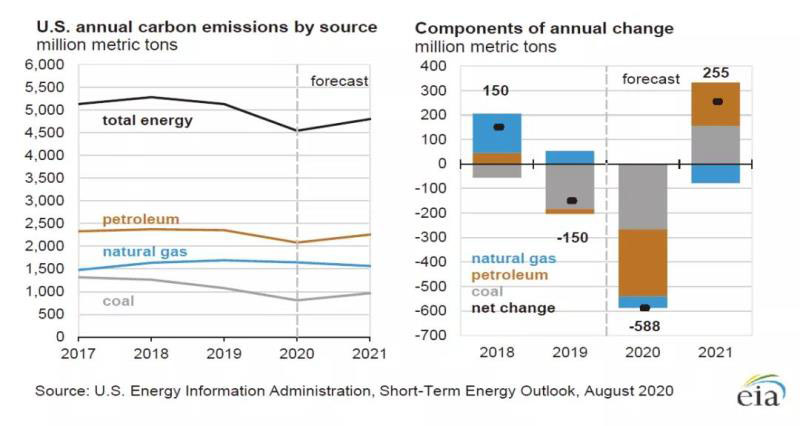 最后,STEO數(shù)據(jù)表明,與能源有關(guān)的二氧化碳(CO2)排放量在2019年減少了2.8%之后,2020 年將減少11.5%(5.88億噸)。這一創(chuàng)紀錄的下降是能源消耗減少的結(jié)果,以及因疫情導(dǎo)致出行活動限制和封鎖導(dǎo)致的經(jīng)濟增長放緩有關(guān)。EIA預(yù)測到2021年,隨著經(jīng)濟復(fù)蘇和居家令取消后,與能源相關(guān)的CO2排放量將增加5.6%。CWEA