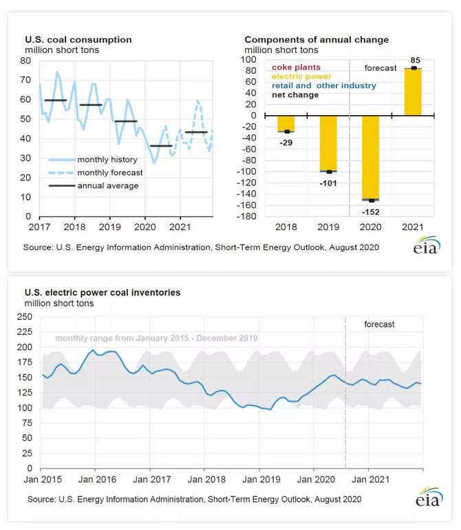 此外,美國煤炭消費量已跌至4月以來的最低點,2020年第二季度總計為9500萬噸(95MMst)。EIA預(yù)計第三季度煤炭消費將升至12700萬噸的季節(jié)性峰值,但到2019年仍將低于2019年水平。EIA估計,到2020年末,美國的煤炭消費量將減少26%,但在2021年可能大幅回升至增長20%。