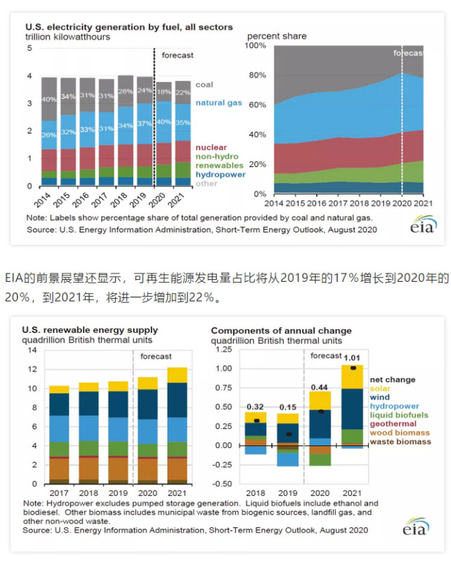 EIA的前景展望還顯示,可再生能源發(fā)電量占比將從2019年的17%增長到2020年的20%,到2021年,將進一步增加到22%。