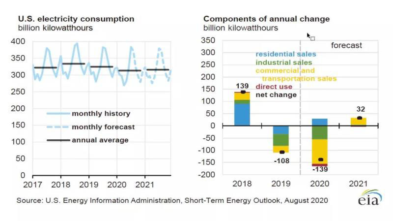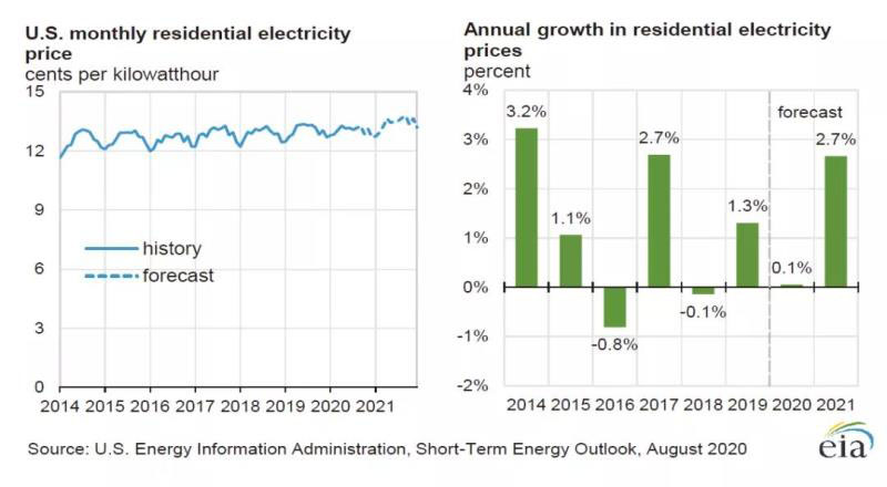 在住宅用電方面,EIA認為2020年會小額增長2%。一旦新冠疫情影響減弱,預(yù)計市場會有復(fù)蘇的跡象,美國總用電量有望增長0.8%。