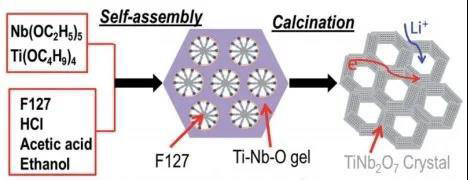 2014年,Goodenough組【7】通過(guò)溶膠凝膠法,采用三嵌段共聚物F127作為表面活性劑,五乙醇鈮作為鈮源,鈦酸四丁酯作為鈦源,乙醇-鹽酸-醋酸作為溶劑,得到凝膠后再馬弗爐中高溫煅燒得到蜂巢狀相互連接的納米孔徑TiNb2O7白色粉末材料。