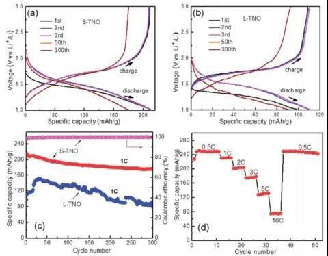圖7 10nm左右的小尺寸S-TNO(圖a)及100nm左右的大尺寸L-TNO(圖b)在1C倍率下,1-3V充放電截止電壓下的充放電曲線、循環(huán)性能、倍率性能