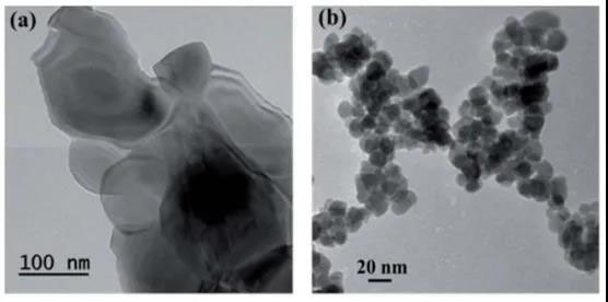 圖6 制得的TiNb2O7納米顆粒粉末,其中a圖是未添加SBA-15模板劑制得的L-TNO,圖b添加SBA-15模板劑制得的S-TNO