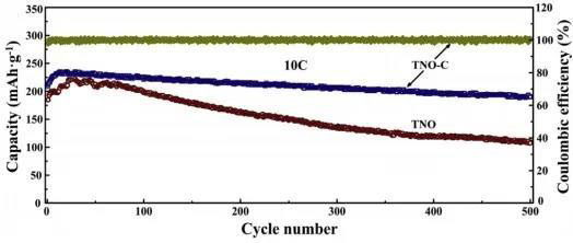 圖4 10C下包覆及未包覆TNO體系循環(huán)性能圖