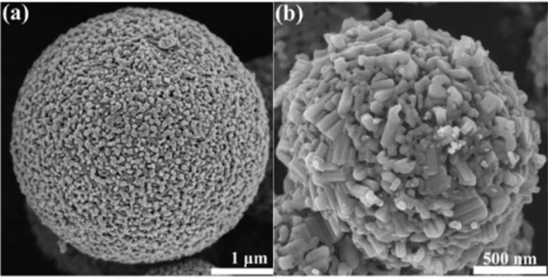 圖3 制備得到的介孔NTO微球SEM圖,其中a圖未包覆,b圖碳包覆