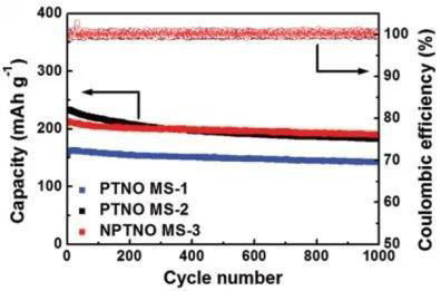 組裝Li金屬半電池在1-3V,0.1C的首次循環(huán)可以發(fā)現(xiàn),由于不活躍氮化物的存在氨氣處理后的NPTNO MS-3體系的初始容量265mAh/g較未進(jìn)行氨氣熱處理的PTNO MS-2的286mAh/g低,但是在5C循環(huán)1000圈時(shí),NPTNOMS-3體系的放電容量為190mAh/g,容量保有率為90%,明顯較PTNO MS-2的182mAh/g(80%)高。