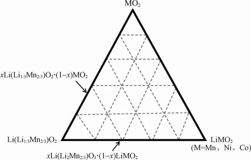 富鋰錳基材料(簡稱Li-rich,OLO)是由美國阿貢實(shí)驗(yàn)室 THACKERAY小組于2001年系統(tǒng)研究并申請專利的正極材料,是由Li2MnO3和LiMO2構(gòu)成的固溶體。與NCM類似,由于其M的多變性和Li2MnO3、LiMO2兩種組成的變化(圖3),導(dǎo)致其主元素含量無法準(zhǔn)確定位,只能采用很寬的范圍界定,從而也削弱了制定該標(biāo)準(zhǔn)的價(jià)值。該正極材料在實(shí)用性方面還面臨電性能不穩(wěn)定的挑戰(zhàn),沒有真正的產(chǎn)品推向市場,因此標(biāo)準(zhǔn)制定有些過于 前瞻。