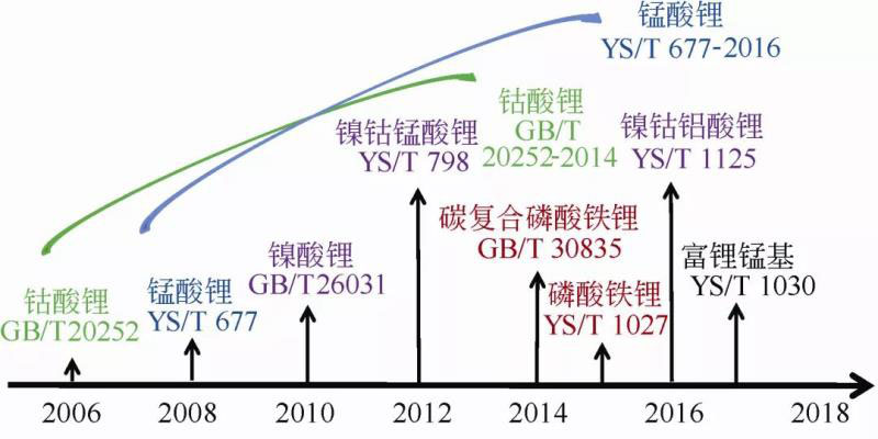 鋰離子電池正極材料在2000年前后開始國產(chǎn)化,最初進(jìn)入市場應(yīng)用的主要是鈷酸鋰和少量的錳酸鋰,因此GB/T 20252—2006《鈷酸鋰》是全國有色金屬標(biāo)準(zhǔn)化技術(shù)委員會(huì)組織發(fā)布的第1個(gè)正極材料國家標(biāo)準(zhǔn)。之后,《錳酸鋰》、《鎳酸鋰》、《鎳鈷錳酸鋰》、《磷酸鐵鋰》、《鎳鈷鋁酸鋰》、《富鋰錳基》等國家或行業(yè)標(biāo)準(zhǔn)先后推出(圖2)。其中,《鈷酸鋰》和《錳酸鋰》分別于2014年和2016年進(jìn)行了標(biāo)準(zhǔn)修訂。