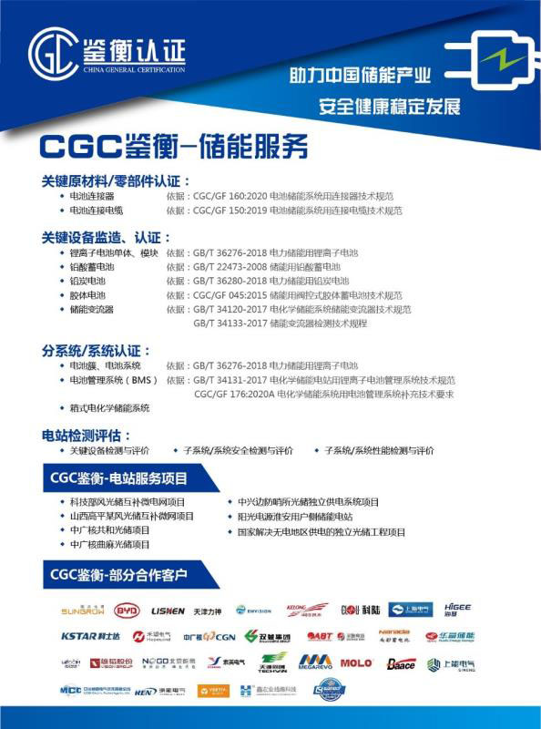 在儲能領(lǐng)域,CGC鑒衡是國內(nèi)最早從事儲能、微電網(wǎng)領(lǐng)域檢測認證服務(wù)的第三方機構(gòu),致力于推動儲能產(chǎn)業(yè)技術(shù)發(fā)展、應(yīng)用和質(zhì)量提升,為我國儲能及可再生能源行業(yè)健康發(fā)展貢獻力量。