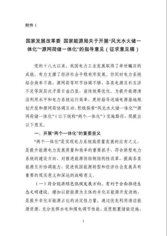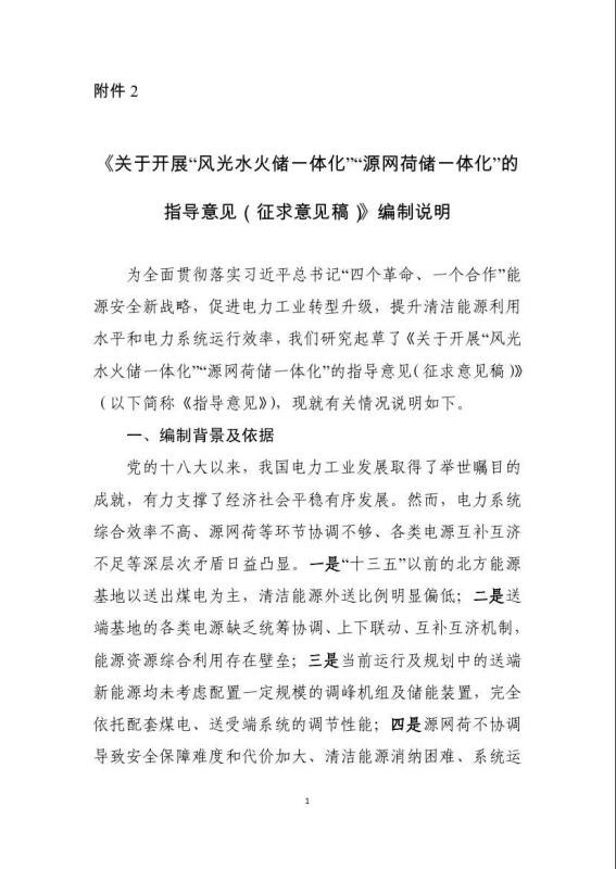 附件:1.國(guó)家發(fā)展改革委 國(guó)家能源局關(guān)于開展“風(fēng)光水火儲(chǔ)一體化”“源網(wǎng)荷儲(chǔ)一體化”的指導(dǎo)意見(征求意見稿)