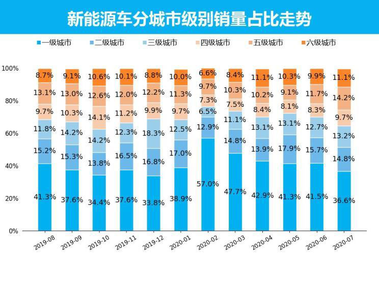 7月新能源車銷量最高的城市級(jí)別為一級(jí)城市,銷量為3.1萬(wàn)輛,銷量占比為36.6%,比上個(gè)月下跌了4.9個(gè)百分點(diǎn);與去年同期相比,一級(jí)城市下跌4個(gè)百分點(diǎn),高線級(jí)城市配套設(shè)施完善,直接影響到新能源車的銷量走勢(shì)。銷量最低的城市級(jí)別為四級(jí)城市,銷量?jī)H為0.8萬(wàn)輛,銷量占比為9.7%,比上個(gè)月上漲了1.4個(gè)百分點(diǎn);與去年同期相比,四級(jí)城市上漲0.2個(gè)百分點(diǎn)。