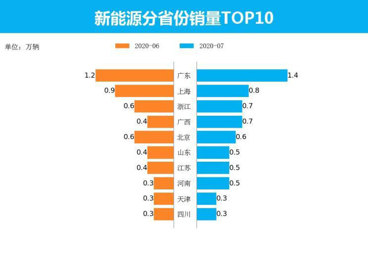 7月新能源車銷量最高的5個(gè)省份(直轄市)為廣東、上海、浙江、廣西、北京,銷量分別為1.4萬(wàn)輛、0.8萬(wàn)輛、0.7萬(wàn)輛、0.7萬(wàn)輛、0.6萬(wàn)輛,占總銷量的48.5%。與上個(gè)月相比,上漲幅度最高的三個(gè)省份為吉林、河北、寧夏,上漲幅度分別為96.3%、90.2%、78.1%。