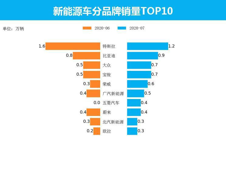 7月份的新能源市場(chǎng),特斯拉依舊一騎絕塵,今年對(duì)于特斯拉來(lái)說(shuō)將是突破的一年。具體到數(shù)據(jù)來(lái)看,我們結(jié)合7月“排水”后的上險(xiǎn)數(shù)(已經(jīng)購(gòu)買交強(qiáng)險(xiǎn)的新能源車數(shù)量),特斯拉在本月的銷量達(dá)到了1.2萬(wàn)輛,雖然相比6月有所下滑,但依舊領(lǐng)先比亞迪0.3萬(wàn)輛。緊隨其后的分別為大眾、寶駿和榮威。其中榮威通過(guò)這一個(gè)月的優(yōu)秀表現(xiàn),成功殺進(jìn)了前五名。