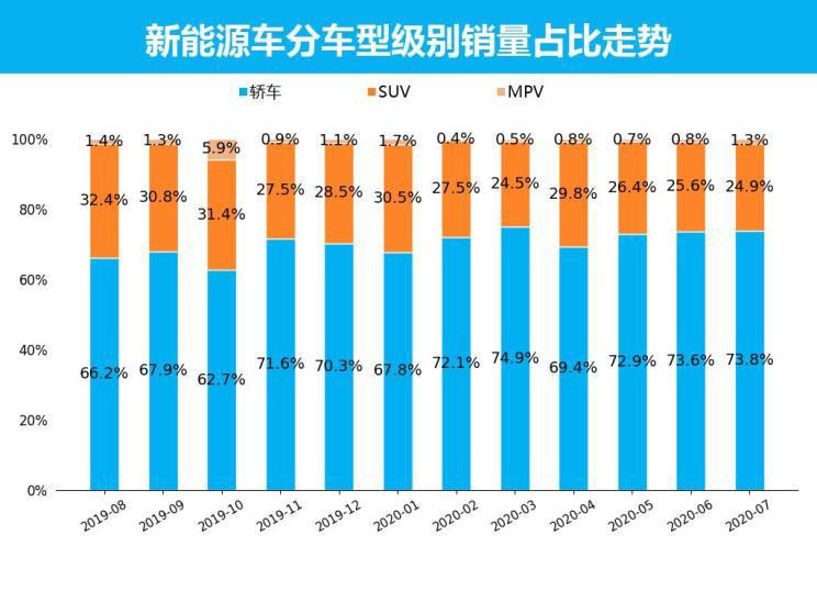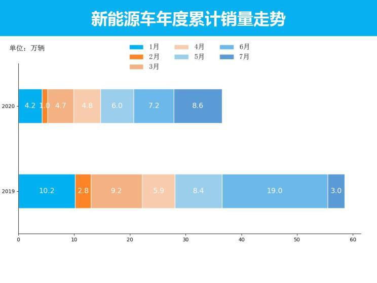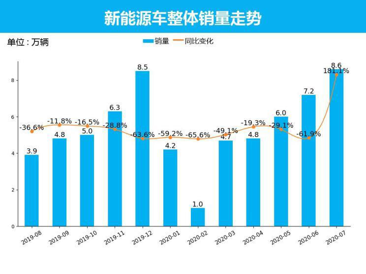 從整體新能源市場(chǎng)銷量情況來(lái)看,2020年7月,新能源車共銷售了8.6萬(wàn)輛,占整個(gè)市場(chǎng)銷量的5.3%。與上個(gè)月相比,新能源車銷量環(huán)比增長(zhǎng)18.2%,與去年同期相比,新能源車銷量同比上漲181.1%。