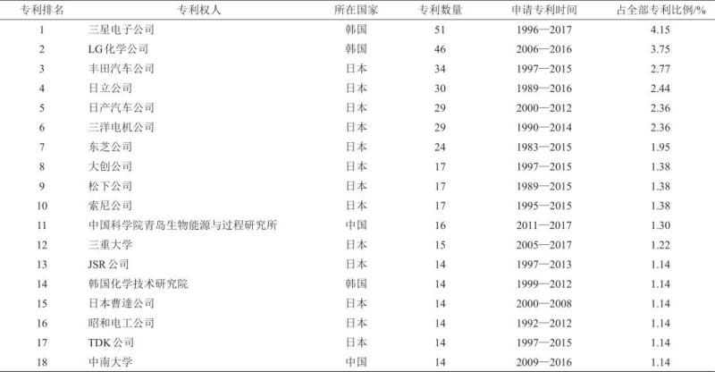 全球全固態(tài)聚合物電解質(zhì)專利申請量排名前18位的專利權(quán)人情況如表4所示。其中前4名的專利數(shù)量較多,均達(dá)到了30件。前10名專利權(quán)人全部來自日本與韓國,并且都為全球知名企業(yè),可見日本、韓國在全固態(tài)聚合物電解質(zhì)這一領(lǐng)域處于國際領(lǐng)先態(tài)勢。中國科學(xué)院青島生物能源與過程研究所、中南大學(xué)在該領(lǐng)域的專利數(shù)量進(jìn)入全球前18名,分別排第11名與18名。在前10名專利權(quán)人機(jī)構(gòu)中,日本的專利權(quán)人最多,占據(jù)8席,它們分別是:豐田汽車公司、日立公司、日產(chǎn)汽車公司、三洋電子、東芝電池公司、日本大創(chuàng)公司、松下集團(tuán)以及索尼集團(tuán)。此外,韓國占據(jù)2席,分別是三星電子公司與LG化學(xué)公司,并且包攬?jiān)擃I(lǐng)域?qū)@麛?shù)量的前2名。