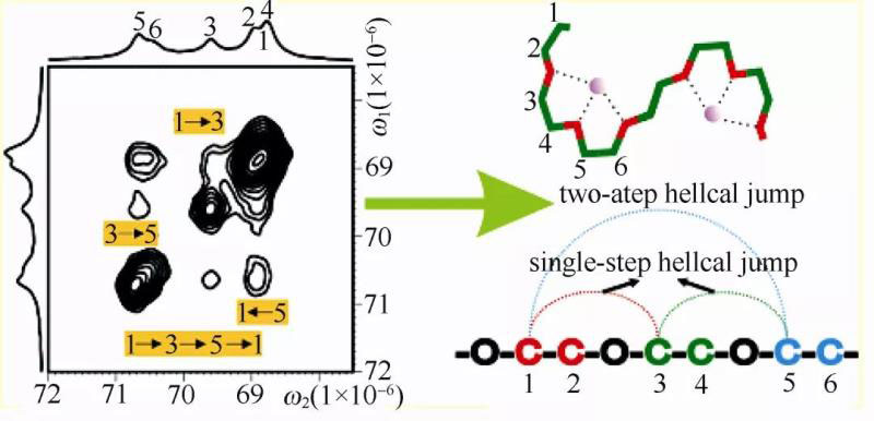 為深刻理解全固態(tài)聚合物電解質(zhì)結(jié)構(gòu)與電化學(xué)性能的構(gòu)效關(guān)系,科學(xué)家對聚環(huán)氧乙烷基全固態(tài)聚合物電解質(zhì)的離子傳導(dǎo)機(jī)理,電極/聚合物電解質(zhì)界面性質(zhì)以及聚合物與導(dǎo)電鹽相互作用等相關(guān)基礎(chǔ)問題進(jìn)行了研究。1993年,BRUCE等利用DSC、NMR、交流阻抗譜等技術(shù)研究發(fā)現(xiàn)鋰離子在 PEO 晶相中是可以發(fā)生遷移的(圖1)。之后,華東師范大學(xué)CHEN等通過高分辨C13二維交叉固態(tài)核磁共振技術(shù)證實(shí),離子在PEO晶相中的定向遷移伴隨著兩個(gè)過程,一是伴隨離子遷移的聚合物分子鏈段的局部運(yùn)動(dòng);另一個(gè)則是離子運(yùn)動(dòng)伴隨著離子配位位置在聚合物鏈內(nèi)和鏈間的變換。美國猶他大學(xué)SMITH等通過分子動(dòng)力學(xué)模擬證實(shí)離子傳導(dǎo)主要在 PEO無定形區(qū)域內(nèi)進(jìn)行,一個(gè)Li+約與五個(gè)醚氧原子發(fā)生配位作用,且Li+的傳輸與PEO鏈段的局域松弛密切相關(guān)。最近,美國佛羅里達(dá)州國家強(qiáng)磁場實(shí)驗(yàn)室的HU等通過選擇性同位素標(biāo)記高分辨固態(tài)核磁技術(shù)研究了Li+的局域結(jié)構(gòu)環(huán)境,并追蹤到Li+在PEO/鋰鑭鋯氧(LLZO)復(fù)合固態(tài)電解質(zhì)中的遷移路徑,這有利于我們更深刻地洞察復(fù)合全固態(tài)電解質(zhì)的離子傳輸機(jī)制。