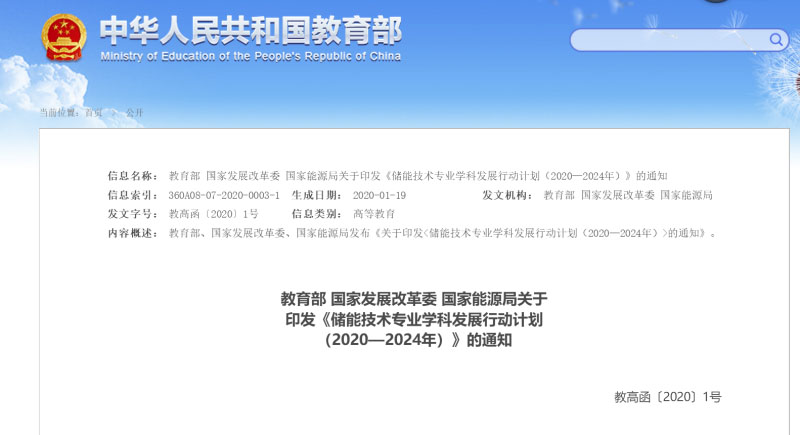 教育部 國家發(fā)展改革委 國家能源局關(guān)于印發(fā)《儲能技術(shù)專業(yè)學科發(fā)展行動計劃(2020—2024年)》的通知