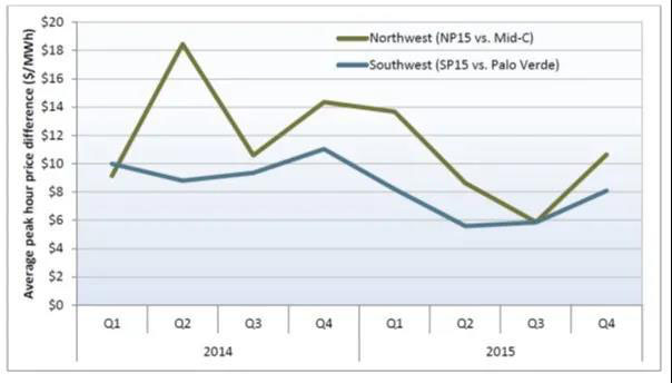 圖3:2014-2015年CAISO市場(NP15區(qū))與美國西北交易中心(Mid-C)和CAISO市場(SP-15區(qū))與西南美國交易中心(SP15區(qū))之間的平均峰時電價差異[15]