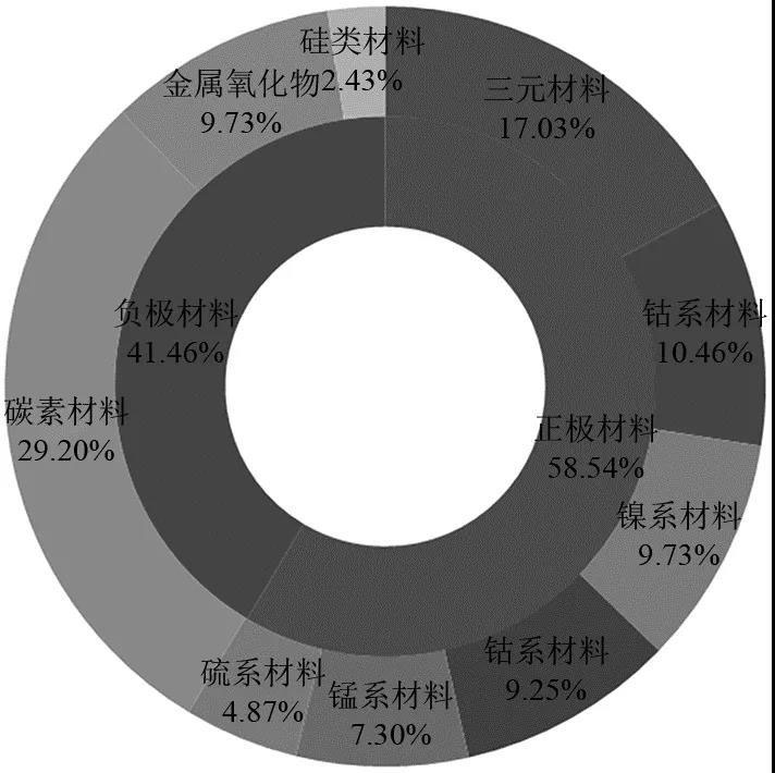 高壓鋰電池依賴于高功率電極材料和高功率電解液,在高功率電極材料中正極材料專利占專利申請(qǐng)總量的58.54%,高于負(fù)極材料的專利申請(qǐng)量,如圖7所示,正極材料中三元材料專利申請(qǐng)所占比例最高,達(dá)到17.03%,三元材料基于其高能量密度等優(yōu)點(diǎn),已經(jīng)成為正極材料研究的熱點(diǎn),其次是鈷系材料,占10.46%。負(fù)極材料專利申請(qǐng)占29.20%,其中碳素材料碳材料具有高比容量,低的電極電位,高的循環(huán)效率,仍然是目前研究熱點(diǎn)和專利申請(qǐng)的重點(diǎn)方向,硅基材料具有較高的能量密度和低的電化學(xué)電勢(shì),近年來(lái)也有一定比例的專利申請(qǐng)。