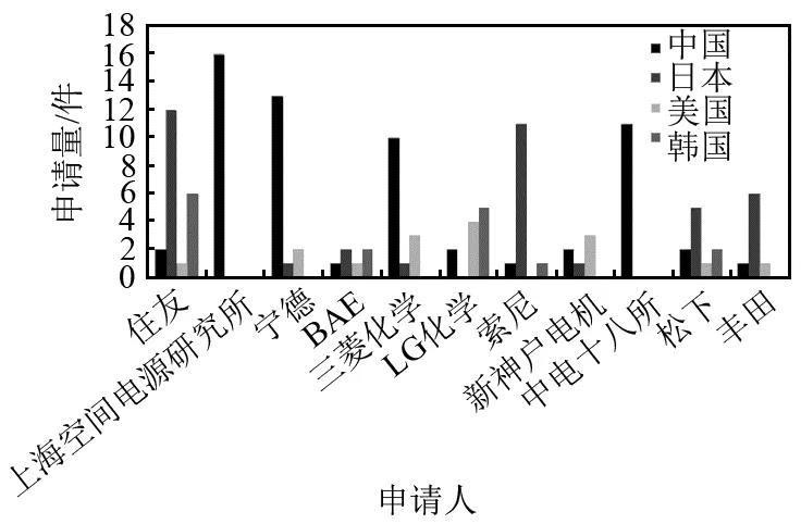 在基礎(chǔ)研究與技術(shù)發(fā)展的支持下,中國(guó)的高比特性高壓鋰離子電池技術(shù)已經(jīng)取得了長(zhǎng)足的進(jìn)展,重要申請(qǐng)人的數(shù)量?jī)H次于日本[8]。國(guó)內(nèi)的上海空間電源研究所和中國(guó)電子科技集團(tuán)公司第十八研究所作為軍工企業(yè),在空間電源技術(shù)領(lǐng)域具有先進(jìn)的技術(shù)研發(fā)能力,寧德時(shí)代在動(dòng)力和儲(chǔ)能電池領(lǐng)域,材料、電芯、電池系統(tǒng)等領(lǐng)域已經(jīng)達(dá)到國(guó)際先進(jìn)水平。