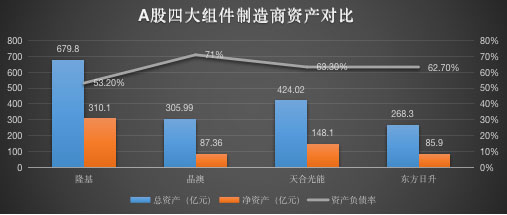 從組件制造商的資產(chǎn)體量上看,隆基資產(chǎn)規(guī)模最大,同時(shí)資產(chǎn)負(fù)債率最低。