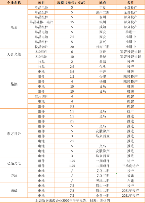 分環(huán)節(jié)來(lái)看,以隆基股份、晶澳科技、天合光能、東方日升等為代表一線組件企業(yè),上半年業(yè)績(jī)均名列前茅。其中隆基股份、晶澳科技、天合光能凈利潤(rùn)同比增長(zhǎng)均超60%以上,三家組件出貨共計(jì)達(dá)18.06GW。此外,2020年上半年也是各頭部企業(yè)大規(guī)模擴(kuò)產(chǎn)的密集期,根據(jù)財(cái)報(bào)數(shù)據(jù),隆基、天合光能、晶澳、東方日升、億晶光電、通威等電池、組件龍頭提及了超過(guò)190GW的落地以及規(guī)劃產(chǎn)能,包括65.7GW組件、83GW電池以及24.6GW拉晶切片、19GW單晶硅棒、硅片、硅片切片。