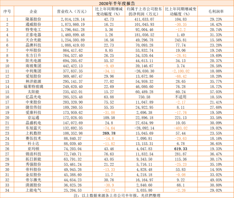 近日,光伏們統(tǒng)計(jì)了包括組件、逆變器、設(shè)備、輔材等共計(jì)34家企業(yè)的半年報(bào)數(shù)據(jù),整體來(lái)看,盡管上半年受疫情影響,但74%的光伏企業(yè)仍實(shí)現(xiàn)了營(yíng)收的正增長(zhǎng)。