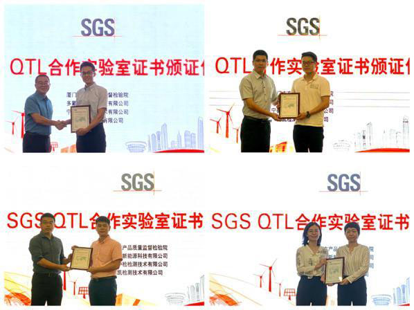 SGS消費電子產(chǎn)品事業(yè)部技術經(jīng)理(左)向廈門市產(chǎn)品質(zhì)量監(jiān)督檢驗院、多氟多新能源科技有限公司、寧德中檢檢測技術有限公司、威凱檢測技術有限公司(右)頒發(fā)SGS QTL合作實驗室證書