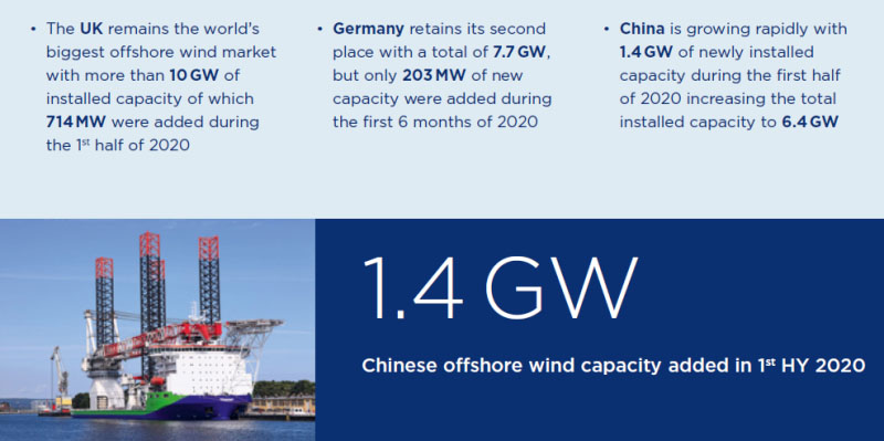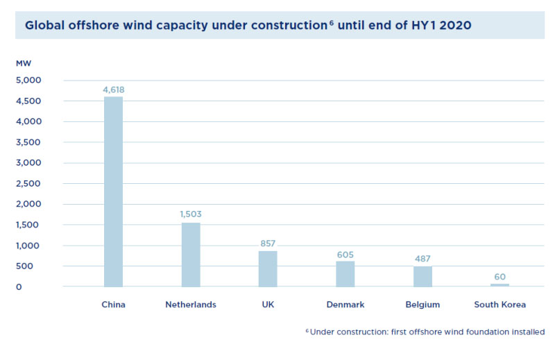 該報(bào)告發(fā)現(xiàn),按國家和地區(qū)劃分,英國仍然是全球最大的海上風(fēng)電市場。英國的裝機(jī)容量超過10GW,其中,2020年上半年新增714MW。