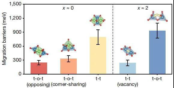 圖4. 在Li3V2O5放電開始時的Li遷移勢壘(x≈0)和放電結(jié)束時的空位遷移勢壘(x≈2)。