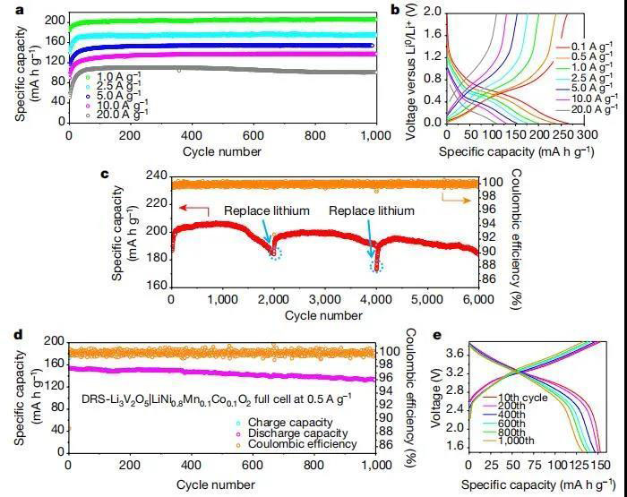 圖3. DRS-Li3V2O5的電化學(xué)性能。(a)電壓窗口為0.01-2.0 V的各種充放電電流密度下的循環(huán)穩(wěn)定性;(b)不同電流密度下的電壓曲線;(c)DRS-Li3V2O5在電流密度為1 A g-1下的長循環(huán)穩(wěn)定性;(d)DRS-Li3V2O5 || LiNi0.8Mn0.1Co0.1O2全電池在0.5 A g-1下的循環(huán)穩(wěn)定性;(e)在1.5-3.9 V的電壓窗口時的電壓曲線。從0.1 A g-1到20 A g-1的電流密度下,測試了活性物質(zhì)載量為2-3 mg cm2的DRS-Li3V2O5 電極,其充電放電時間為2.66h至20s。