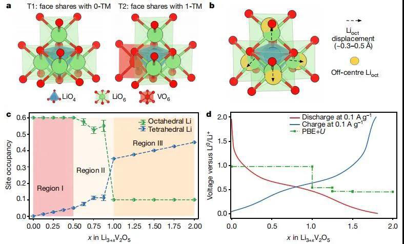 圖2. 由DFT計算得出DRS-Li3+xV2O5的 Li位置占有率和電壓曲線。(a)0-TM(T1)和1-TM(T2)四面體Li插入位點;(b)當(dāng)Li插入0-TM(T1)位點時,四個相鄰的LiO 6八面體的偏心位移;(c)根據(jù)DFT計算,在插入Li后,四面體和八面體中Li位置占有率的演變;(d)根據(jù)PBE+U函數(shù)計算得出的實驗和計算電壓曲線。