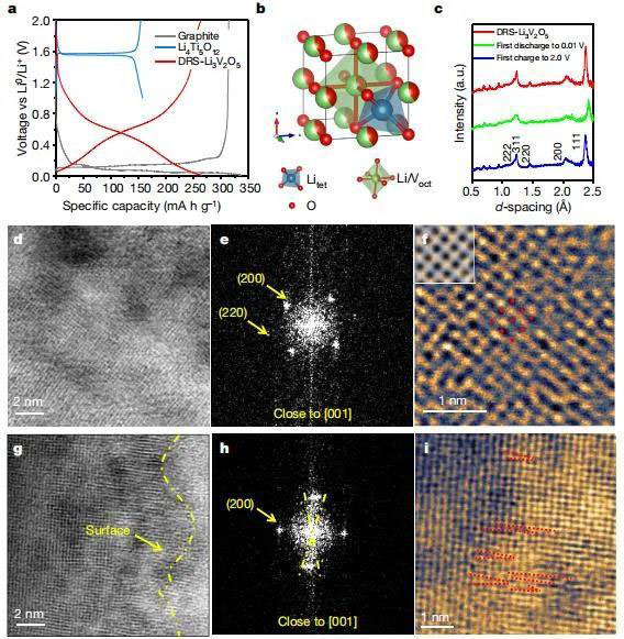 圖1. 原始和鋰化DRS-Li3+xV2O5的電壓曲線和結(jié)構(gòu)表征。(a)在電流密度為0.1 A g-1的情況下,石墨、Li4Ti5O12和DRS-Li3+xV2O5的實驗電壓曲線;(b)DRS-Li3+xV2O5的晶體結(jié)構(gòu);(c)DRS-Li3+xV2O5和鋰化DRS-Li3+xV2O5的中子衍射;(d-i)DRS-Li3+xV2O5的ABF-STEM圖像和快速傅里葉變換。