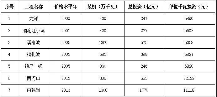 篩選我國(guó)2000年以來開工建設(shè)符合調(diào)節(jié)庫(kù)容≥50億立方米;調(diào)節(jié)性能≥年調(diào)節(jié);裝機(jī)規(guī)?!?00萬千瓦三個(gè)條件的水電站,工程投資情況見表1。