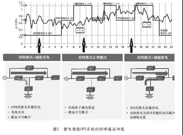 這就要求UPS系統(tǒng)對其整流器、充電器、直流母線系統(tǒng)的精確控制和監(jiān)控能力。憑借著多項運(yùn)算及控制處理專利技術(shù),伊頓93PR600kW系統(tǒng)具備了這種智能電力調(diào)配功能,在鋰電儲能系統(tǒng)的應(yīng)用基礎(chǔ)上,預(yù)留部分容量以應(yīng)對在市電斷電期間仍然為重要負(fù)荷提供后備電源的前提下,在電價低時對鋰電池系統(tǒng)充電儲能;在電價高時精確控制市電供電與鋰電池放電電力的比例以平移高峰時段用電量,削峰填谷;在負(fù)荷高峰時段放電以避免用電量溢出。在同等的電力使用量的情況下,通過削峰填谷的智能電力調(diào)配來達(dá)到節(jié)約數(shù)據(jù)中心電費(fèi)開支的目的(見圖2)。
