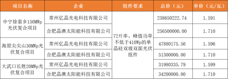 2020年9月8日,華潤集團(tuán)公示中寧徐套鄉(xiāng)150MWp光伏復(fù)合項目、海原尖尖山30MWp光伏復(fù)合項目、大武口長勝20MWp光伏復(fù)合項目組件集中采購中標(biāo)候選人,3項目共計容量200MW。根據(jù)公告,常州億晶光電科技有限公司位列3個項目組件采購第一中標(biāo)候選人。