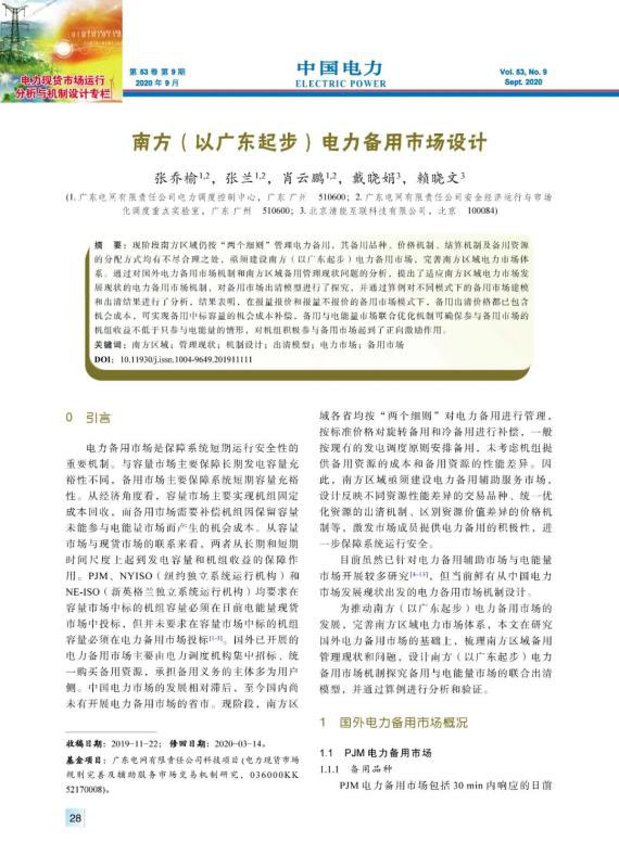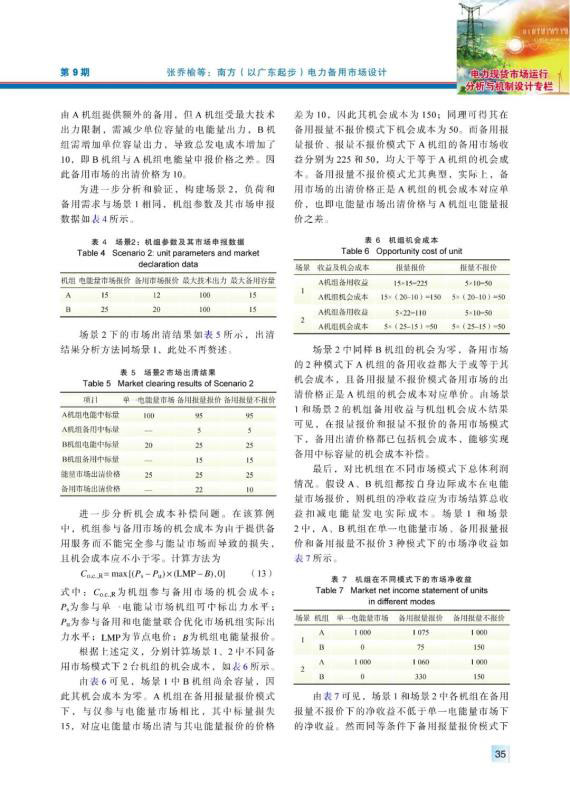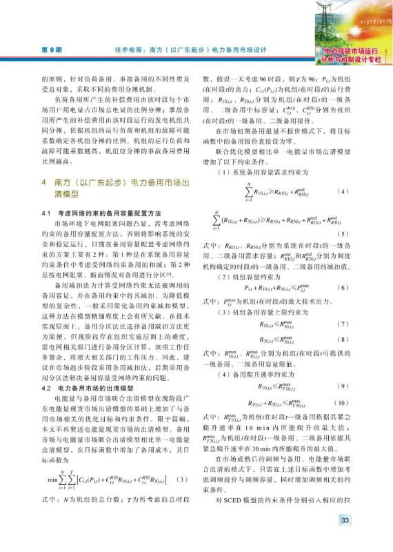 現(xiàn)階段南方區(qū)域仍按“兩個(gè)細(xì)則”管理電力備用,其備用品種、價(jià)格機(jī)制、結(jié)算機(jī)制及備用資源的分配方式均有不盡合理之處,亟須建設(shè)南方(以廣東起步)電力備用市場,完善南方區(qū)域電力市場體系。通過對國外電力備用市場機(jī)制和南方區(qū)域備用管理現(xiàn)狀問題的分析,提出了適應(yīng)南方區(qū)域電力市場發(fā)展現(xiàn)狀的電力備用市場機(jī)制,對備用市場出清模型進(jìn)行了探究,并通過算例對不同模式下的備用市場建模和出清結(jié)果進(jìn)行了分析,結(jié)果表明,在報(bào)量報(bào)價(jià)和報(bào)量不報(bào)價(jià)的備用市場模式下,備用出清價(jià)格都已包含機(jī)會成本,可實(shí)現(xiàn)備用中標(biāo)容量的機(jī)會成本補(bǔ)償,備用與電能量市場聯(lián)合優(yōu)化機(jī)制可確保參與備用市場的機(jī)組收益不低于只參與電能量的情形,對機(jī)組積極參與備用市場起到了正向激勵作用。