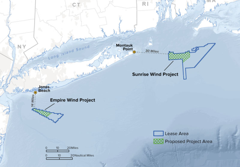 Empire Wind海上風(fēng)電項(xiàng)目,預(yù)計(jì)裝機(jī)容量2GW,位于紐約市長島東南15-30英里附近海域,是Equinor在美國海上風(fēng)電的第一筆大投資。項(xiàng)目占地80000英畝,水深在65到131英尺之間。所發(fā)電力足以為100萬戶家庭供電。預(yù)計(jì)安裝的風(fēng)機(jī)單機(jī)容量裝機(jī)為10-15MW。