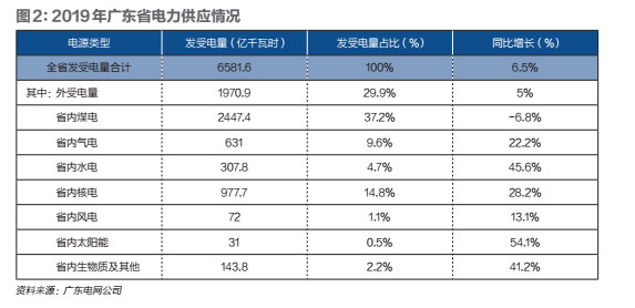 根據(jù)《廣東電力市場(chǎng)2019年度報(bào)告》,2019年廣東的發(fā)受電量合計(jì)6581.6億度,其中外受電量1970.9億度,約占30%,這部分外受電量以西電東送的水電為主,具有季節(jié)波動(dòng)性。